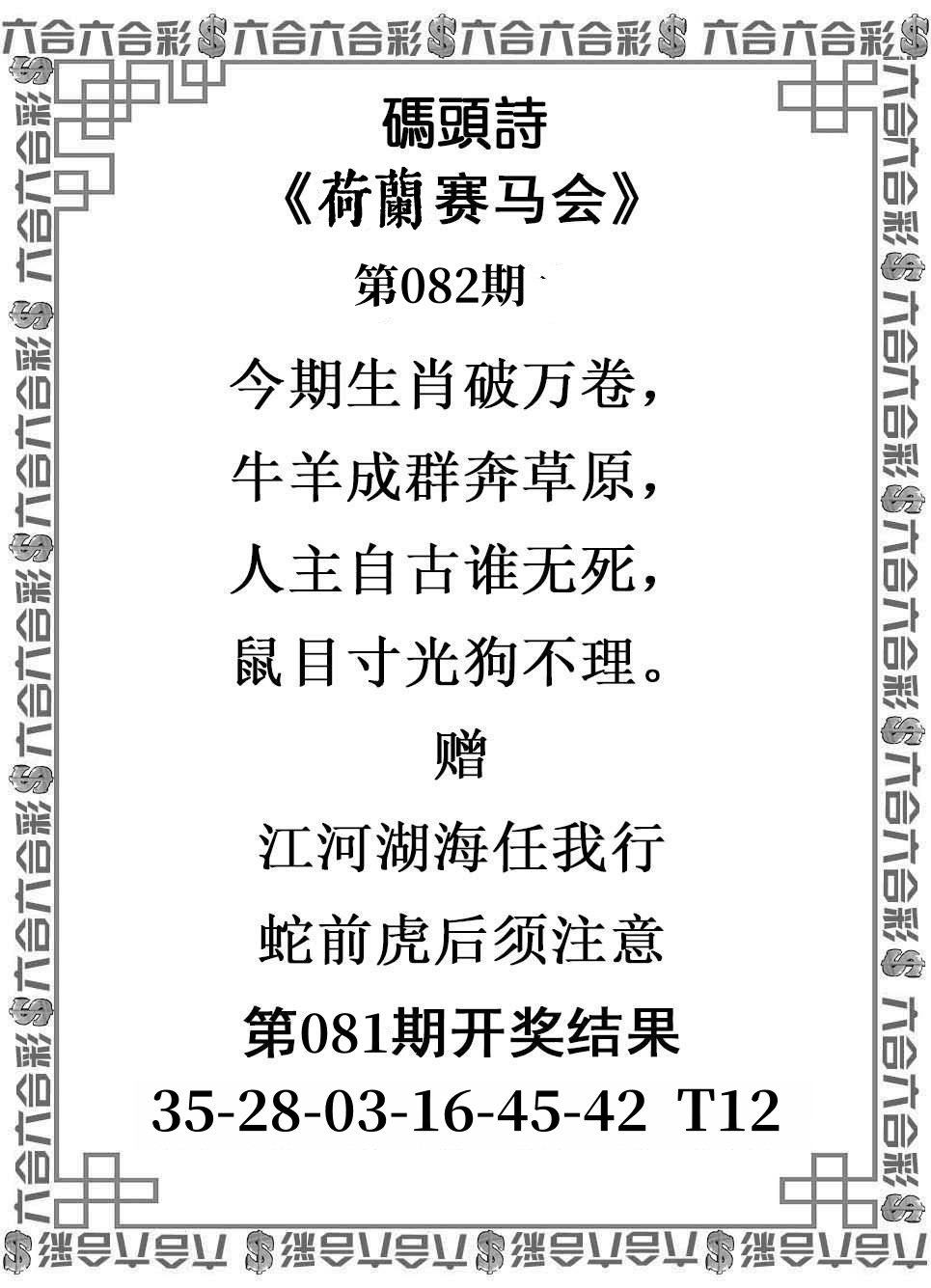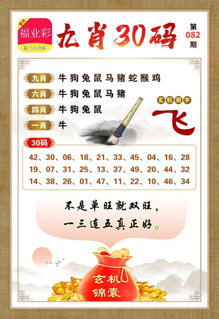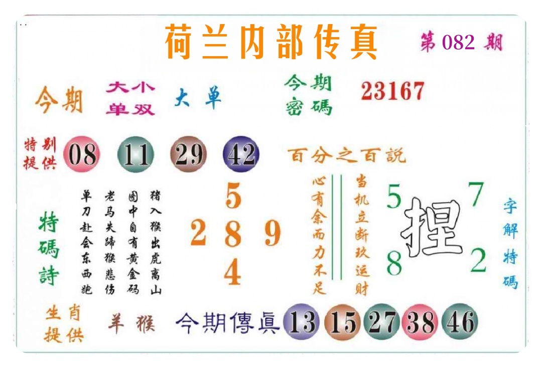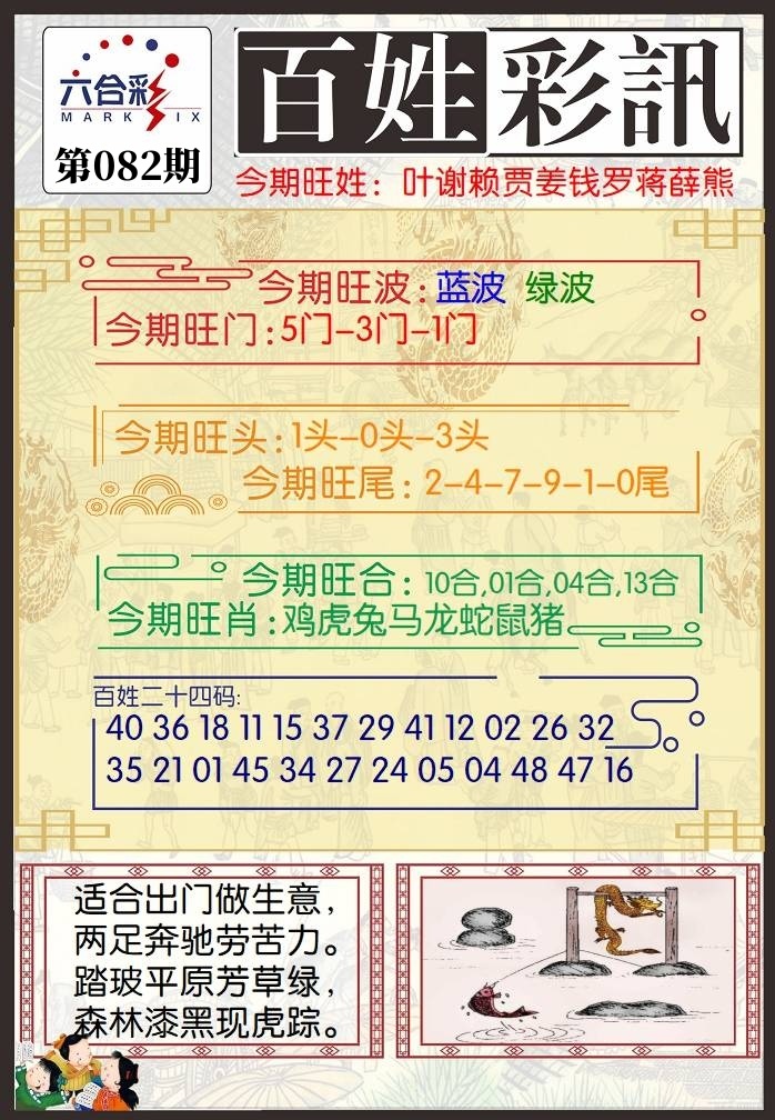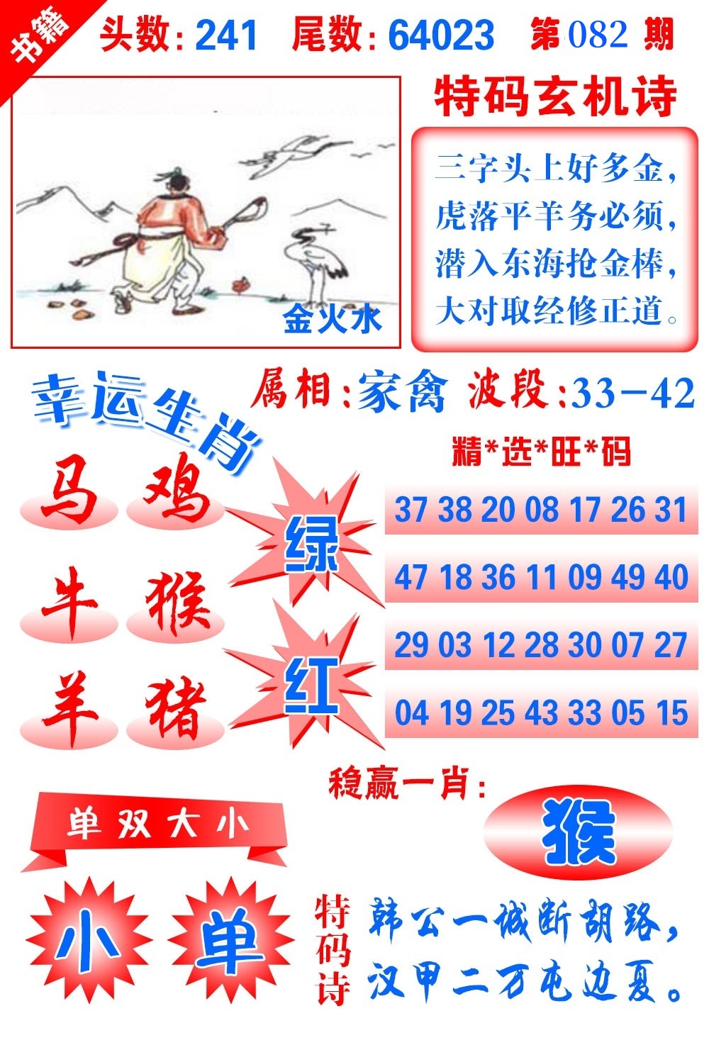 | 082期 | 男:龙虎猴牛 | 女:猪鸡蛇兔 | 中:?00 |