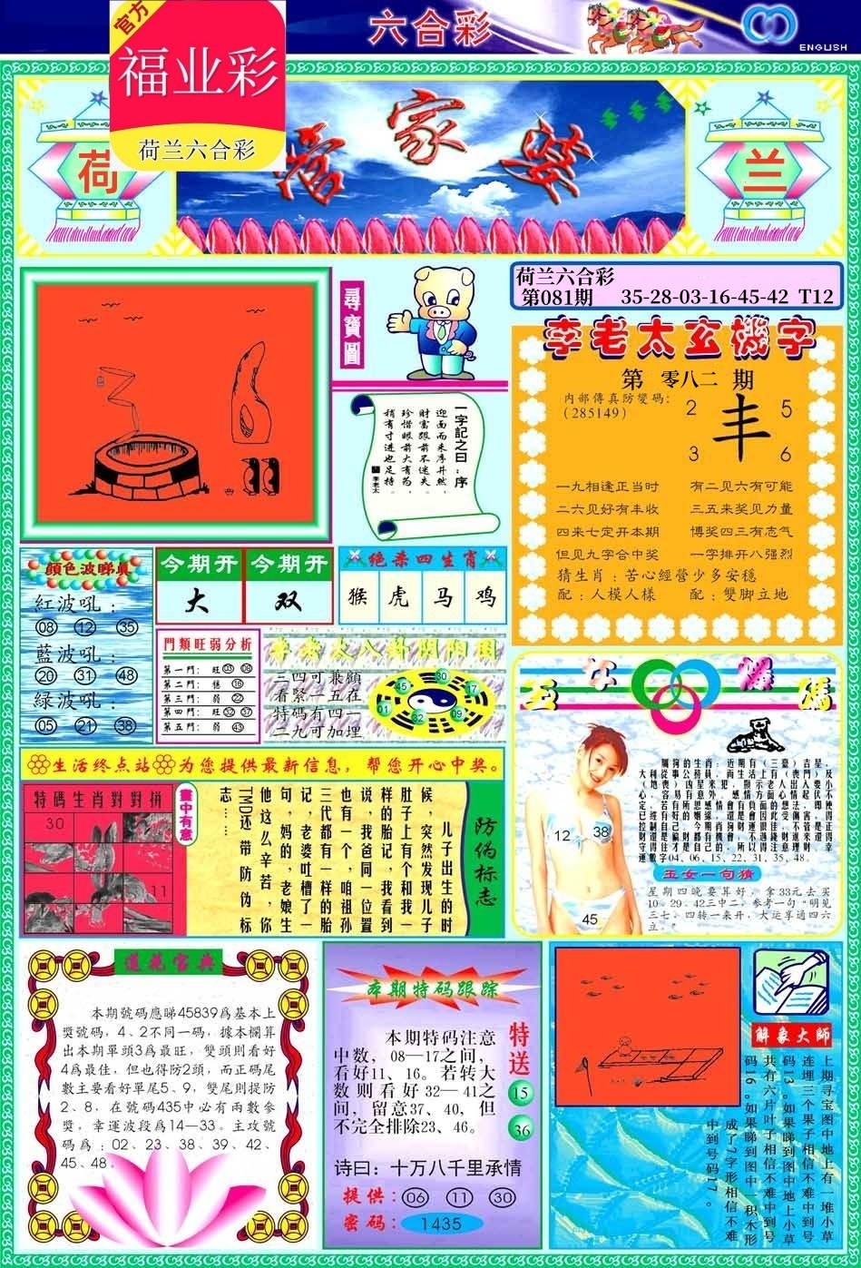 | 081期 | 男:马鼠龙虎 | 女:兔羊猪鸡 | 中:羊12 |